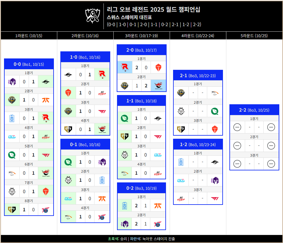 스위스 스테이지는 16개 팀이 5라운드까지 경기를 치르며, 3승 시 토너먼트 진출, 3패 시 탈락이라는 단순하면서도 냉정한 구조입니다. 현재 롤드컵 2025 T1은 1승 2패로 더 이상 물러설 수 없는 상황이며, 남은 4R 경기에서 반드시 승리를 거둬야 합니다.